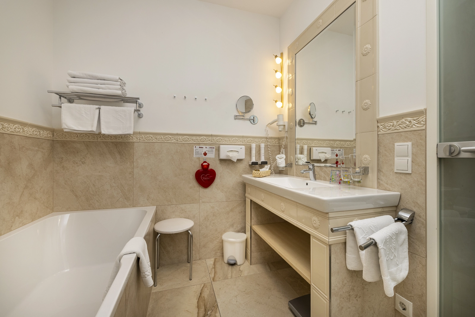 Separates Kinderzimmer, Schreibtisch, Smart-TV, Telefon, kostenloses WLAN, Safe, Haarföhn, Kosmetikspiegel, Bademäntel (auch für Kinder), Badtücher, Poolhandtücher (auch im Wellnessbereich jederzeit tauschbar), Badetasche sowie für Ihr persönliches Wohl mit Anti-Allergiker- Bettwäsche.