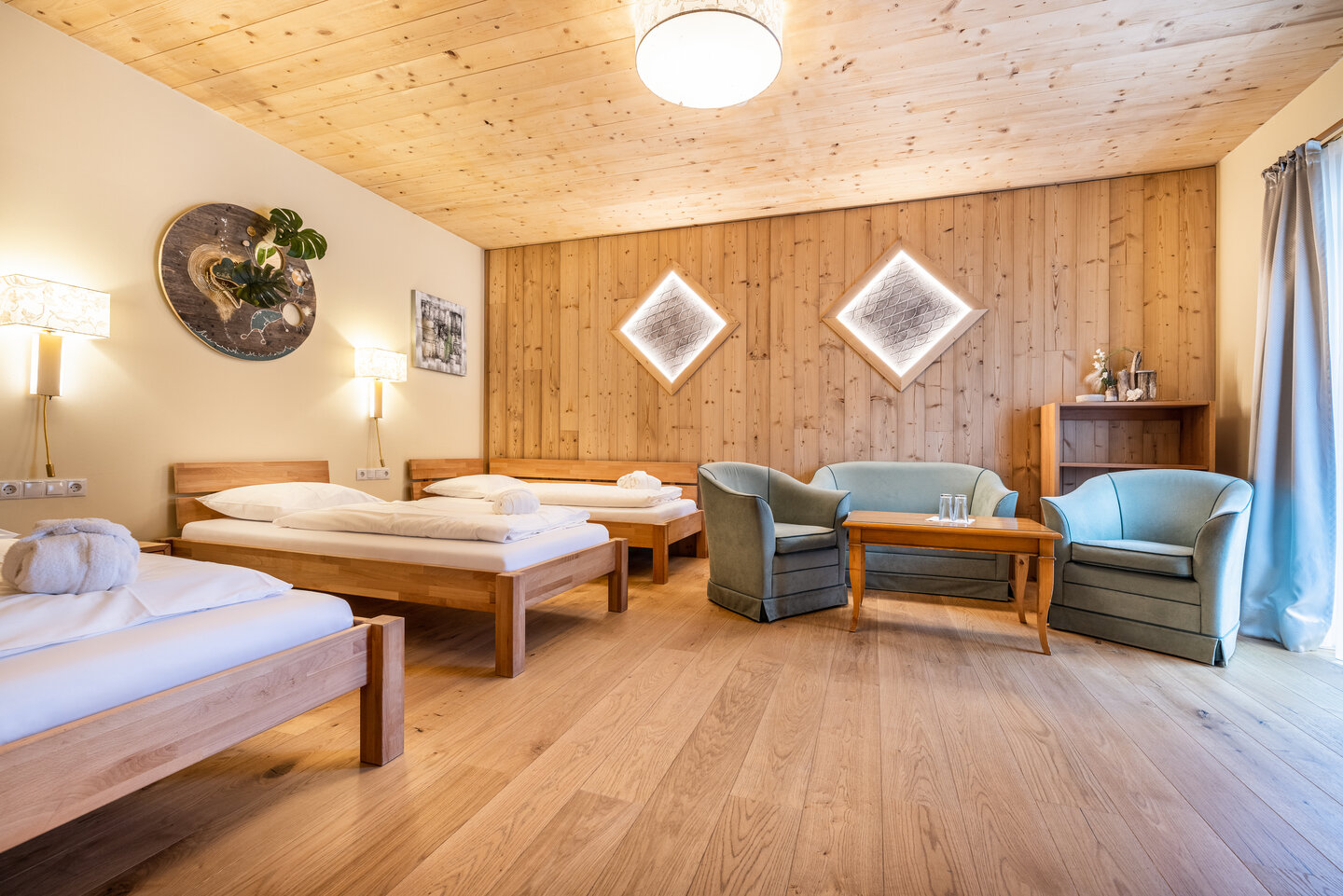 Die exklusive Junior Suite ist optimal für Familien und hat eine Wohngröße von ca. 40 – 50 m². Mit einem separaten Kinderzimmer für bis zu 3 Personen, Bad mit Dusche oder Wanne, separates WC und Balkon (Ost- oder Westseite). Genießen Sie den herrlichen Blick auf die umliegende Bergwelt.