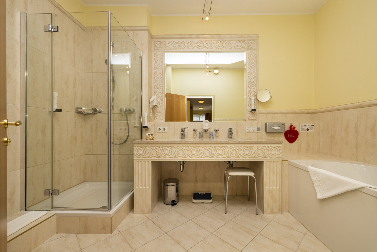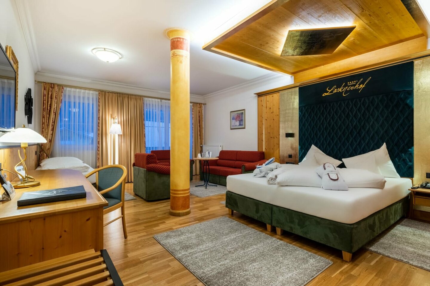 Schreibtisch, zusätzliches Einzelbett und Ausziehcouch, Smart-TV, Telefon, kostenloses WLAN, Safe, Haarföhn, Kosmetikspiegel, Bademäntel (auch für Kinder), Badtücher, Poolhandtücher (auch im Wellnessbereich jederzeit tauschbar), Badetasche sowie für Ihr persönliches Wohl mit Anti-Allergiker- Bettwäsche.