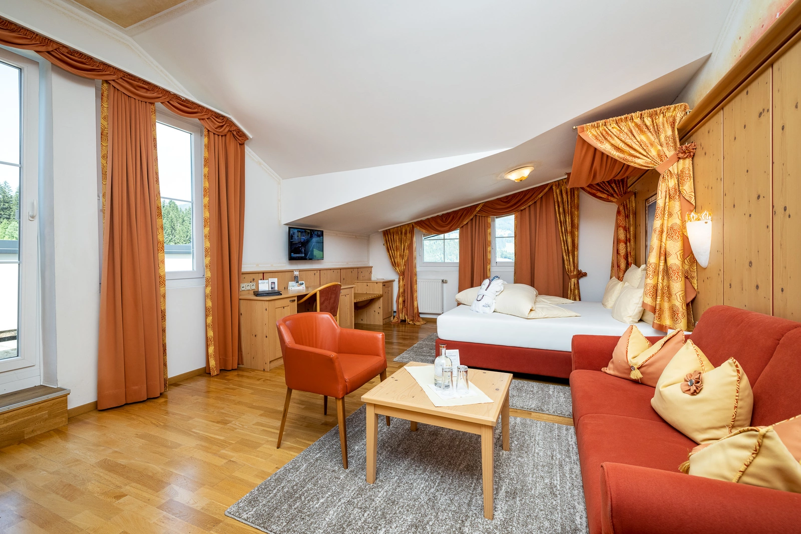 Das geräumige Schlosszimmer hat eine Wohngröße von 35-45 m². Ausgestattet mit Doppelbett, 3. Bett und zusätzliches Ausziehsofa, einem Bad mit Dusche oder Wanne, separates WC, Balkon (Süd- oder Ostbalkon), Schreibtisch und Wohnecke. Genießen Sie den herrlichen Blick auf die umliegende Bergwelt.