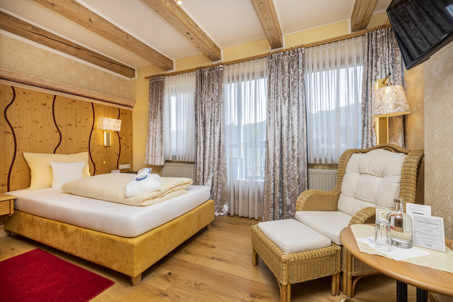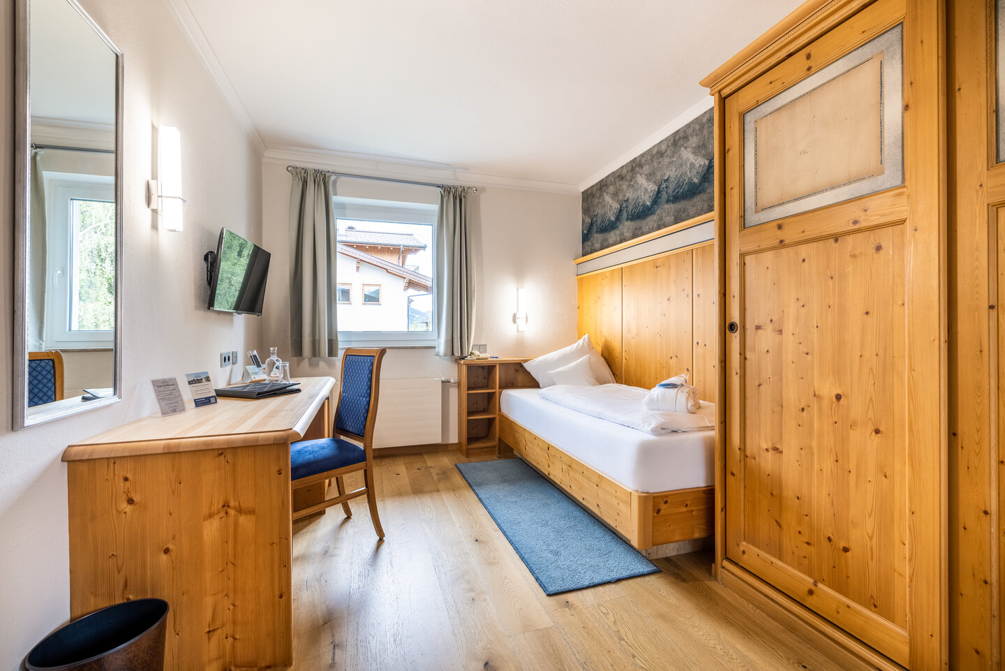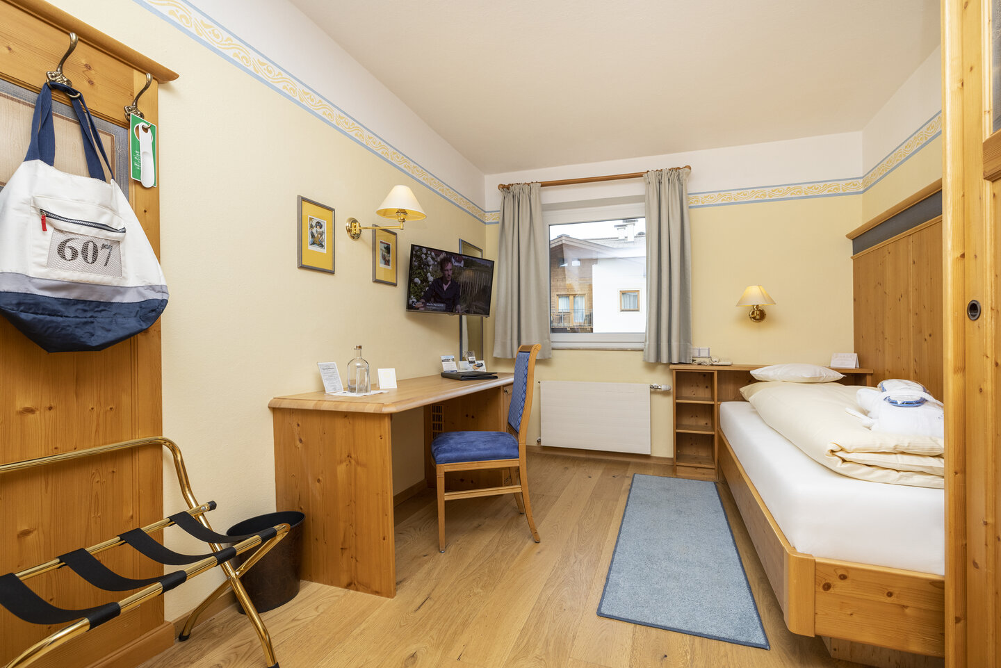 Das Einzelzimmer hat eine Wohngröße von ca. 20 m². Ausgestattet mit einem Parkett, einem Bad mit Dusche und WC, teilweise mit Balkon genießen Sie den herrlichen Blick auf die umliegende Bergwelt.